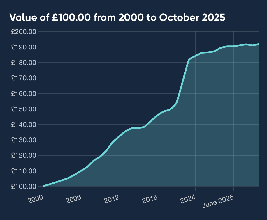 For example, in England prices have increased by 91.9% between 2000 and October 2025. In other words, you would need £191.86 in October 2025 to have the same purchasing power as £100.00 in 2000.